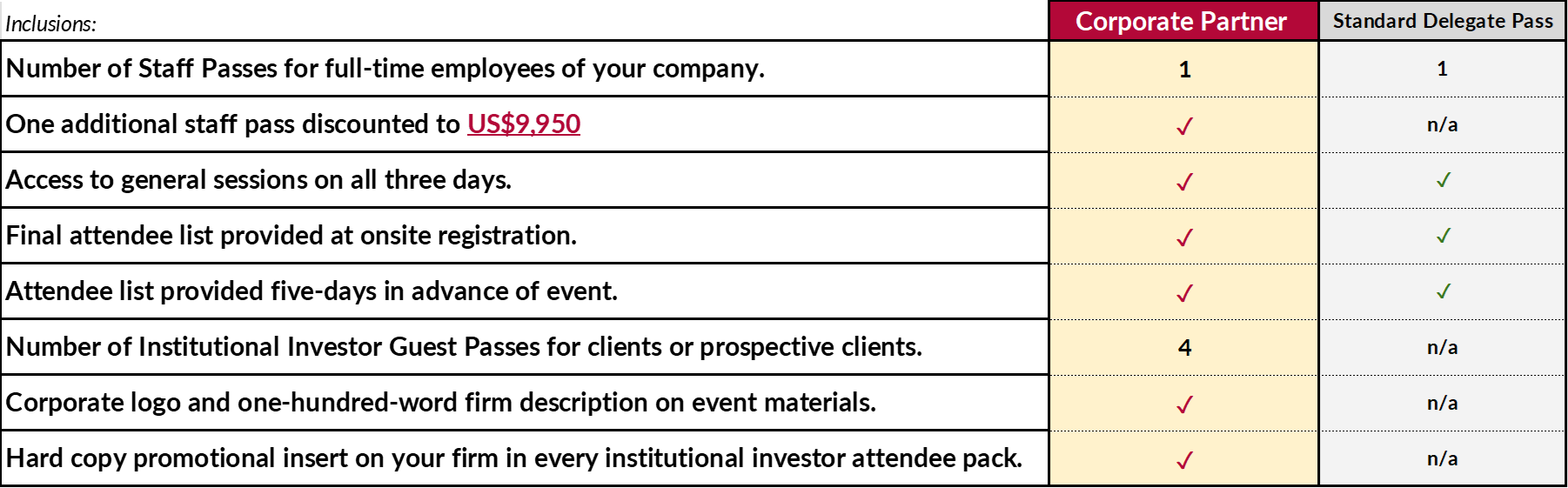 ** Please note this is only a summary of the Corporate Partner and Delegate Pass inclusions. For a more detailed inclusion list, please email Samantha Allwork via samantha@global-arc.net